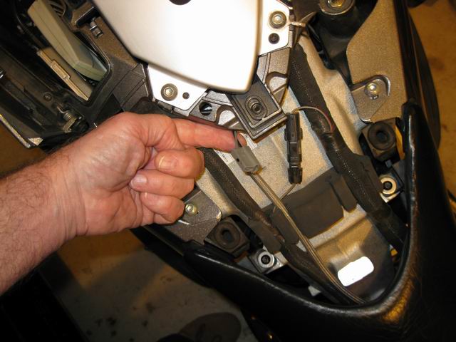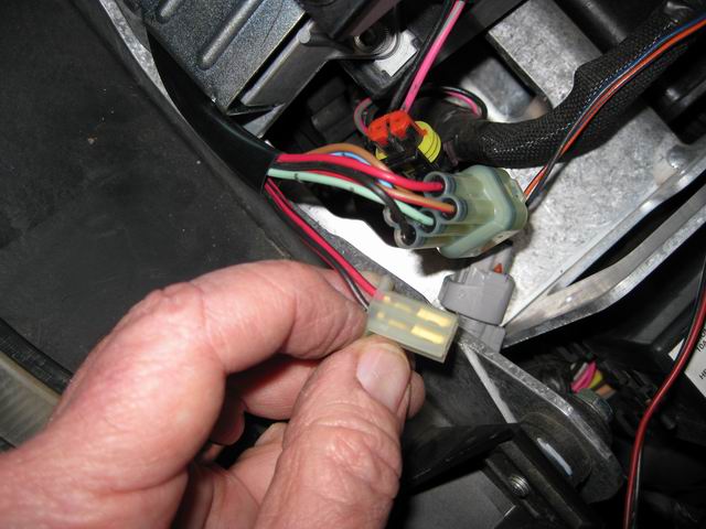 Connector under tank cover meant for a powerlet. A male flag connector will fit in the grey/pink slot and provide power for accessories without cutting wires. 20 Amp max. Runs off the horn fuse which powers the powerlets.