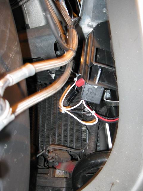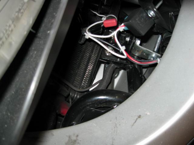 Stebel installation in place of stock horn. Looking up into the left side (from drivers view, right side from front) of bike.