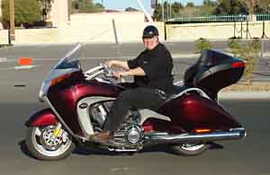 Well it gets too late to ride back so we stay another night in Vegas (bummer) and we then get some friends together and ride the strip. We pull into the Harley Cafe which is packed with motorcycles on a Friday night and the place pours out to check out the Vision. The riders that were there were all over it stopping all the walking traffic on the strip as people wanted their pictures taken with it. We ride the strip, cruise out of Vegas to get some miles on it and get another Victory dealer involved (Beth Parker of Victory Lane in Florida) by having her ride passenger. Beth commented on the smooth ride, lots of room and best of all no wind blast and this is typical of all passengers we had ride during the time the Vision was with us. On the way back I stop at a truck scale and tell the guy in the window to give me the weight of this thing and he looks at me like I am wacked-out or something. Then he realizes this is no ordinary motorcycle and I have to swear him to secerecy. Dave makes the comment they said not to ride it, I said, "Well they will only spank us once and the way I figure it we have a couple of more days to put it through the test and enjoy riding it. So hell, lets roll!"